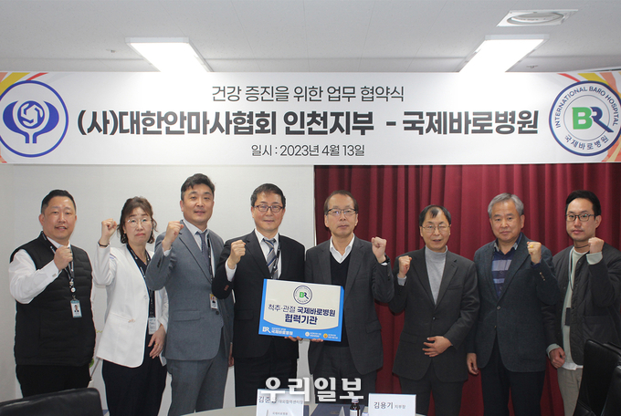【우리일보 김선근 기자】 (사)대한안마사협회인천지부(회장 김용기)는 보건복지부지정 관절전문 국제바로병원(병원장 이정준)을 안마사협회 회원들의 건강증진과 척추관절 지정진료소로 지정하는 진료협약을 지난 13일 체결했다고 17일 밝혔다.