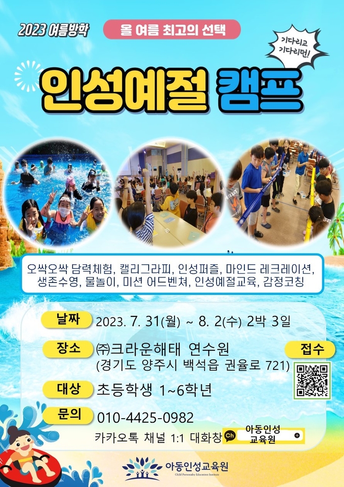 【우리일보 김선근 기자】 아동인성교육원이 다가오는 여름방학을 맞아 전국의 초등학교 1~6학년 대상으로 인성예절캠프를 개최한다.