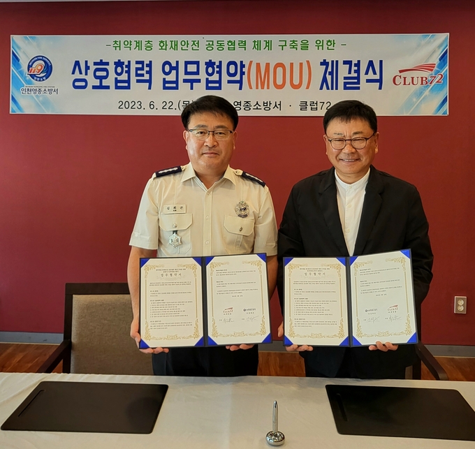 【우리일보 김선근 기자】 영종소방서(서장 김희곤)와 CLUB72(대표 최영범)은 22일 상호존중과 신뢰를 바탕으로 영종 지역 내 화재 안전과 취약계층 소방시설 보급 등 사회공헌 구축을 위한 업무협약(MOU)를 체결했다.
