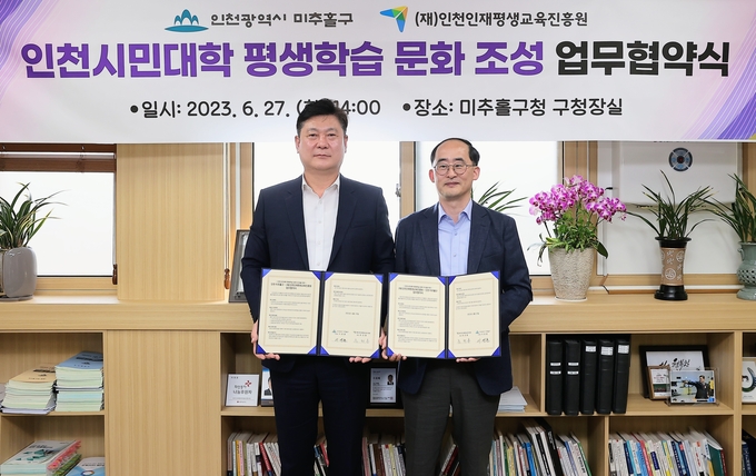 【우리일보 김선근 기자】 | 인천 미추홀구가 인천인재평생교육진흥원과 27일 인천시민대학 평생학습 문화 조성을 위한 업무협약을 체결했다.