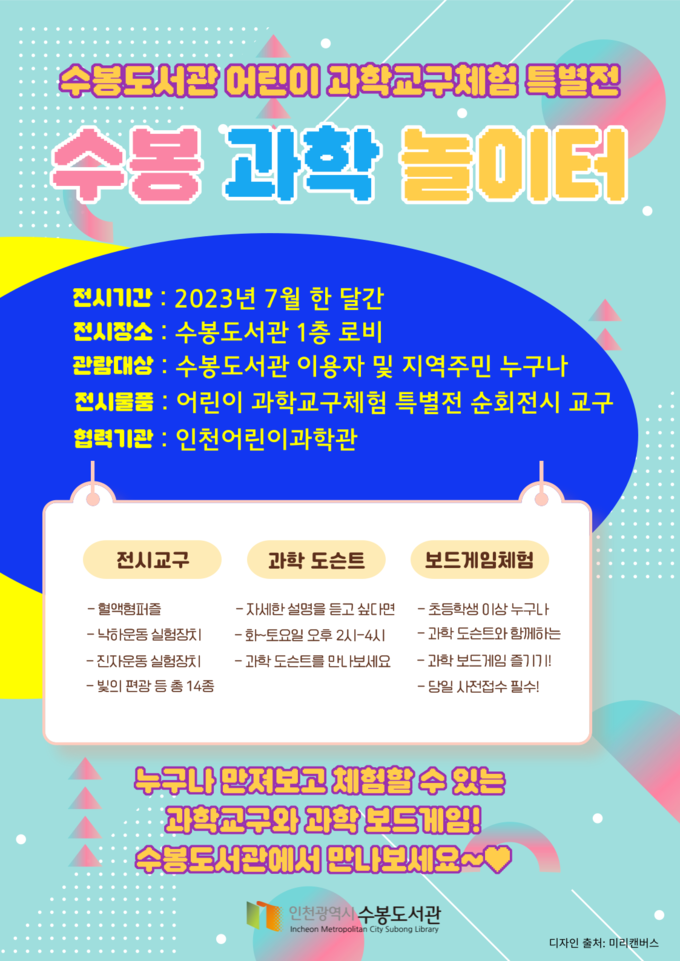 이번 체험 전시는 수봉도서관 1층 로비에서 7월 한 달간 운영되며 화요일부터 토요일 오후 2시~4시 사이에는 교구에 대한 자세한 설명과 과학 보드게임을 즐길 수 있는 과학 도슨트 시간도 운영될 예정이다.