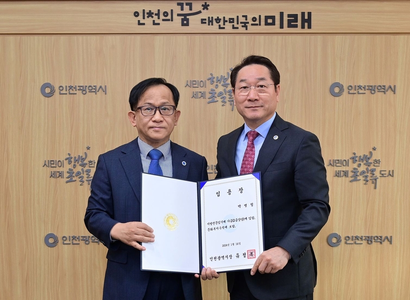 【우리일보 이진희 기자】 | 유정복 인천시장이 16일 시청 접견실에서 박병철 문화복지수석에게 임용장을 수여하고 있다.
