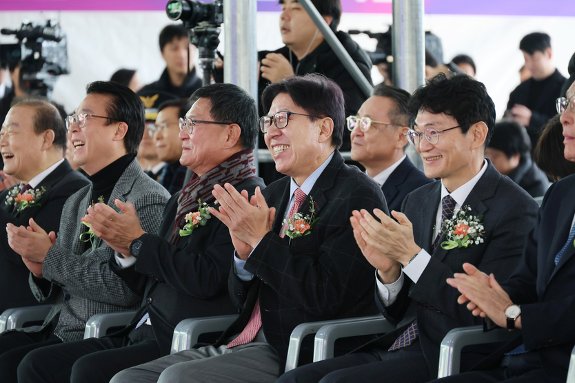 ▲ "부산 수산의 새로운 도약"… 환하게 웃는 내빈들 착공식에 참석한 박형준 시장(오른쪽 두번째)과 강도형 장관(오른쪽) 등 내빈들이 행사를 지켜보며 박수를 치고 있다. 이날 참석자들은 공동어시장의 변화가 가져올 지역 경제 활성화에 대한 기대감 을 나타냈다.