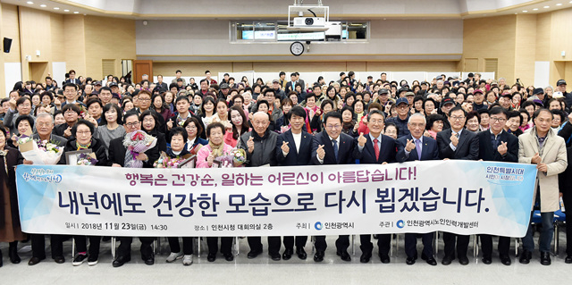 【김종진 기자】박남춘 인천광역시장이 23일 시청 대회의실에서 열린 '2018년 노인일자리 및 사회활동지원사업 통합평가회'에서 참석자들과 기념촬영을 하고 있다.[사진제공=인천시]