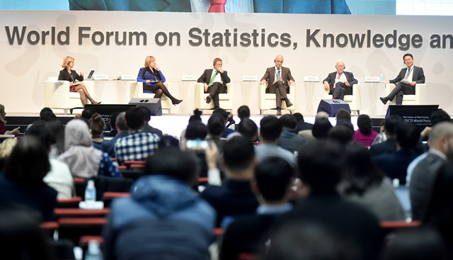【장명진 기자】박남춘 인천광역시장이 29일 송도컨벤시아에서 열린 '제6차 OECD 세계포럼'에서 '미래웰빙계획'을 주제로 전체회의 세션 발표를 하고 있다.(왼쪽부터 마틴듀란 OECD 통계국장, 알렌카 스메르콜 슬로베니아 전 개발부장관, 사이먼 업튼 뉴질랜드 의회 환경위원회 위원장, 파스칼 드 페트리니 다논 아태지역 CEO, 앨런 커먼 프랑스 사회과학고등연구원 명예교수, 박남춘 인천광역시장)[사진제공 =인천시대변인실]