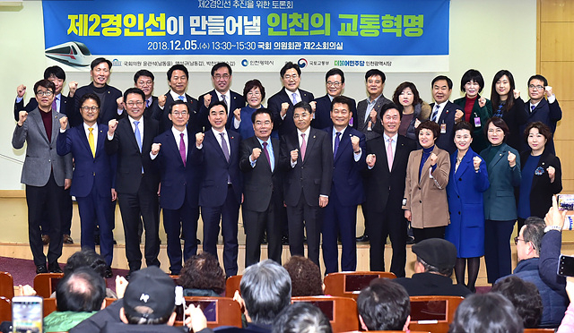 【장명진 기자】박남춘 인천광역시장이 5일 국회의원회관 제2소회의실에서 열린 '제2경인선 조속 추진을 위한 토론회'에서 참석자들과 기념촬영을 하고 있다.[사진제공=인천시]