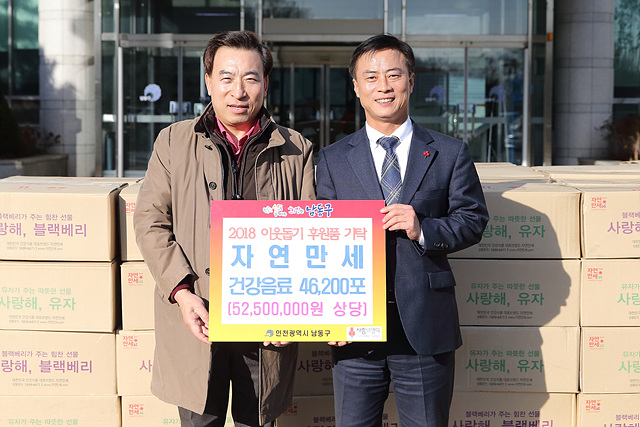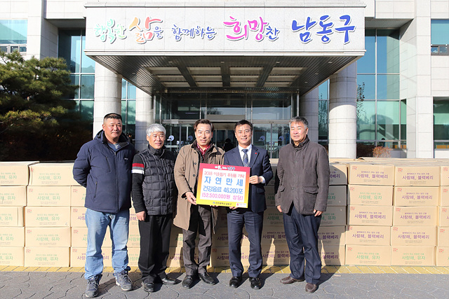 【장명진 기자】자연만세(회장 천준필)가 12월7일 오후 2시30분 인천 남동구청(구청장 이강호)현관에서 관내 소외계층을 위한 5천2백여만원 상당 건강음료 210박스를 기부했다.