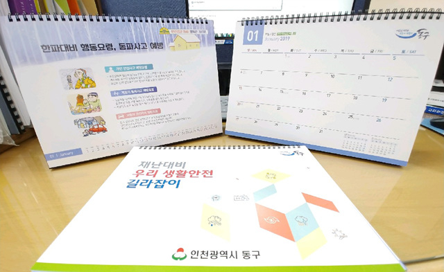 【이현숙기자】인천 동구(구청장 허인환)는 2018년 안전한 지역사회 만들기 모델사업의 일환으로 월별 ․ 계절별 ․ 재난 안전 행동요령이 담긴 2019년도 탁상 달력을 4,000부를 제작해 직원 및 안전취약계층에 배부할 계획이라고 밝혔다.