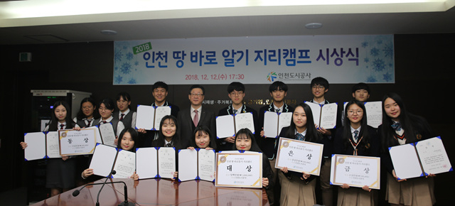 【박현구 기자】인천도시공사(사장 박인서)는 청소년 대상 사회공헌 사업인‘꿈꾸는 청소년 응원사업’의 일환으로 ‘2018 인천 땅 바로알기 지리캠프’대회를 후원하고, 12일 공사 상황실에서 시상식을 개최했다고 밝혔다.