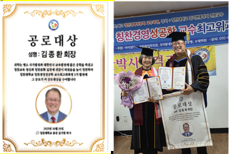 【우리일보 이은영 기자】 부평 디지털해피스치과 김종환 대외협력부장이 고려대 평생교육원 산하 칭찬대학에서 주관하는 '칭찬경영성공학 교수 최고위과정 3기 졸업식'에서 영예의 공로대상을 수상했다.