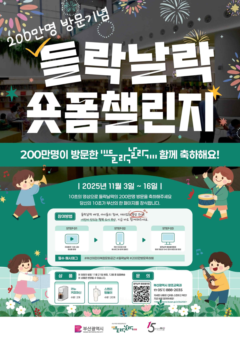 【우리일보 김지윤 기자】 부산 어린이복합문화공간 ‘들락날락’이 누적 방문 200만 명을 넘어서며 시민참여형 ‘숏폼 챌린지’를 오늘(11월 3일)부터 16일까지 진행한다.