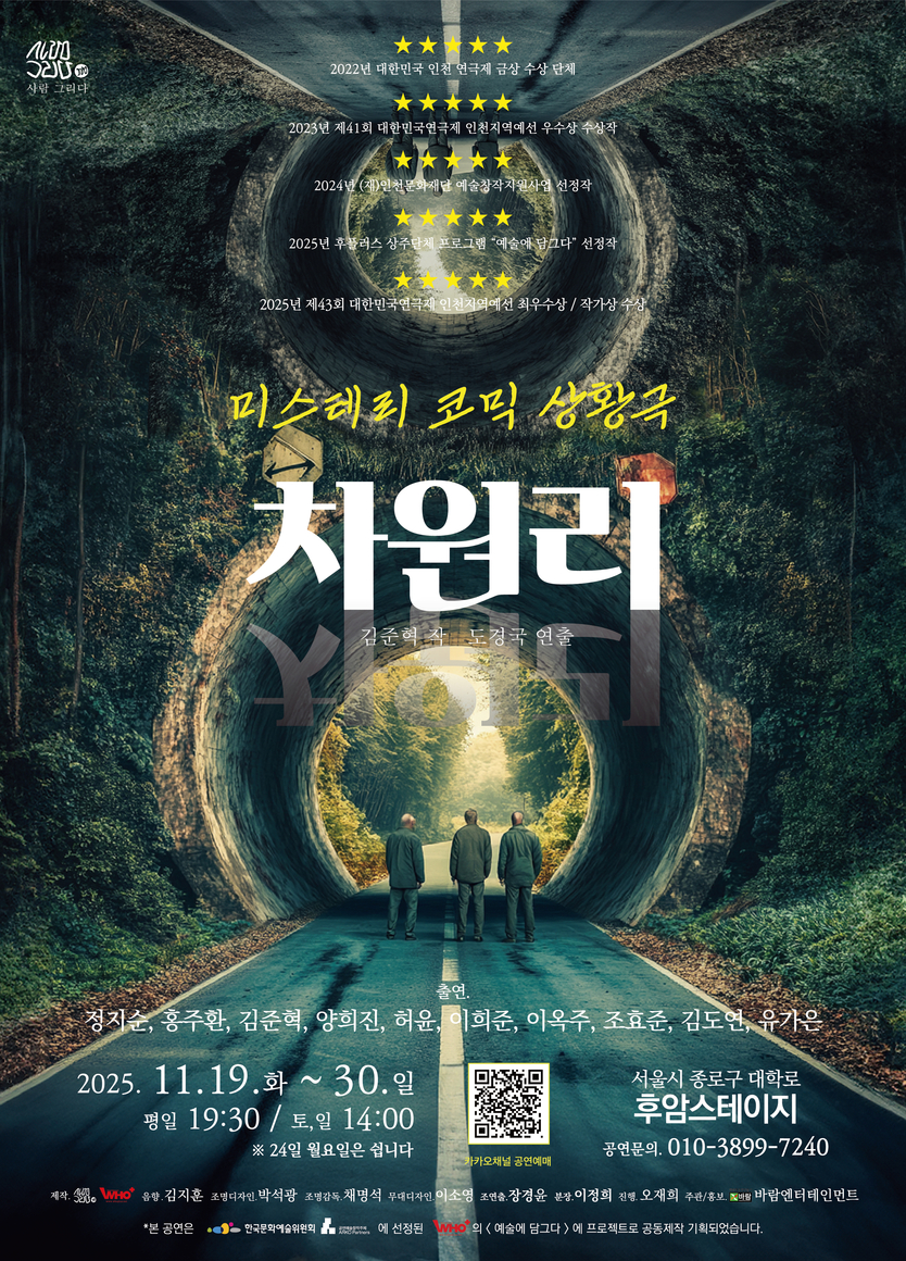 【우리일보 이은영 기자】 제43회 대한민국연극제 인천지역 예선에서 최우수상과 작가상을 수상한 극단 ‘사람 그리다’의 대표작, 미스터리 코믹 상황극 '차원리'가 11월 19일부터 30일까지 서울 대학로 후암스테이지에서 다시 관객을 만난다.