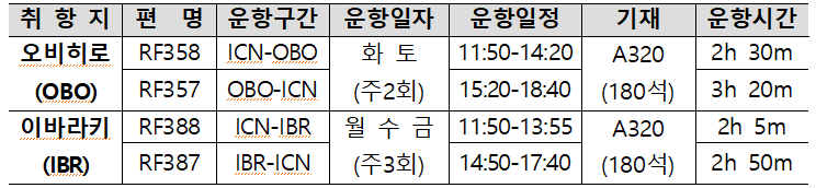 에어로케이항공이 운항하는 인천-오비히로 노선은 11일부터 주 2회 운항을 시작하며, 인천-이바라키 노선은 12일부터 주 3회 운항할 예정이다.