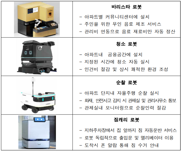 이번 시범사업은 국내 공동주택을 대상으로 로봇 통합 관제 플랫폼을 적용한 첫 사례라는 점에서 의미가 크다. 관리사무소와 관제센터는 통합 시스템을 통해 로봇 운행 현황을 한눈에 확인하고, 화재나 안전사고 등 이상 징후가 감지되면 즉시 대응할 수 있도록 체계를 갖췄다. 향후에는 창문을 청소하는 외벽청소 로봇, 고령자와 근로자의 신체 부담을 줄여주는 웨어러블 보조 로봇 등 유상 렌털 서비스도 도입해 주거환경 개선과 노동강도 완화에 활용할 계획이다.