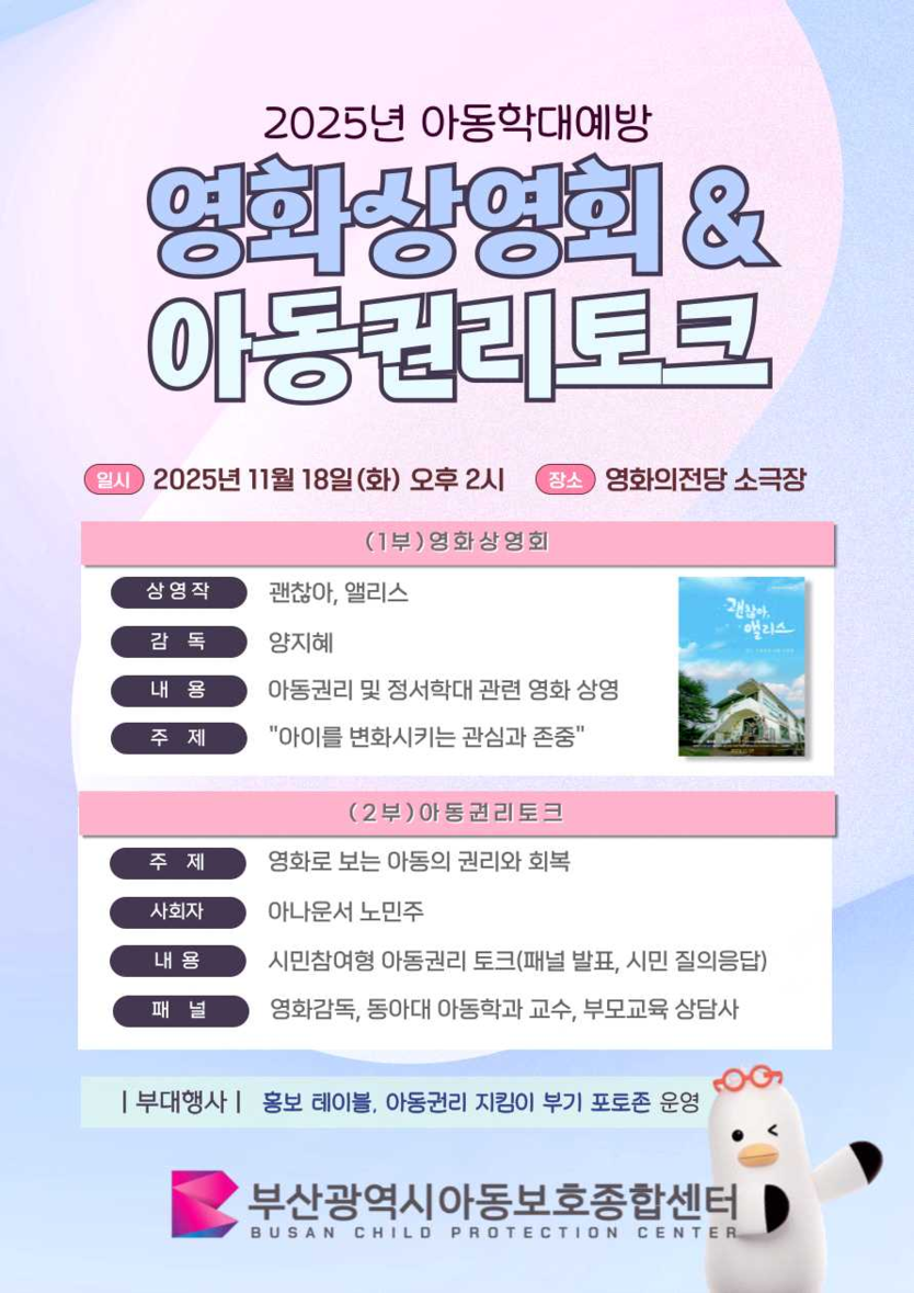 영화 상영 후에는 감독과 전문가들이 함께하는 ‘아동권리토크’가 이어진다. 대담에는 양지혜 감독, 이승희 동아대학교 아동학과 교수, 현장 실무자가 패널로 참여해 작품에 담긴 메시지와 실제 아동학대 예방 활동의 접점을 중심으로 이야기를 나눈다. 토크에서는 영화 속 장면을 바탕으로 가정과 학교, 지역사회에서 아이의 목소리를 어떻게 더 잘 듣고 보호할 수 있을지에 대한 논의가 이뤄질 예정이다.