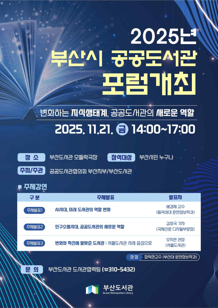 박은아 부산도서관장은 “개관 5주년을 맞아 여는 이번 포럼은, 급변하는 시대에 공공도서관이 어떤 방향으로 나아가야 할지 시민과 함께 고민하는 출발점”이라며 “앞으로도 부산뿐만 아니라 인근 지역 도서관과 긴밀히 협력해, 공공도서관이 지역사회와 함께 성장하는 동반자가 되도록 힘쓰겠다”고 말했다. 포럼 참가 신청은 부산도서관 누리집를 통해 사전 접수하거나, 행사 당일 현장 등록도 가능하다.