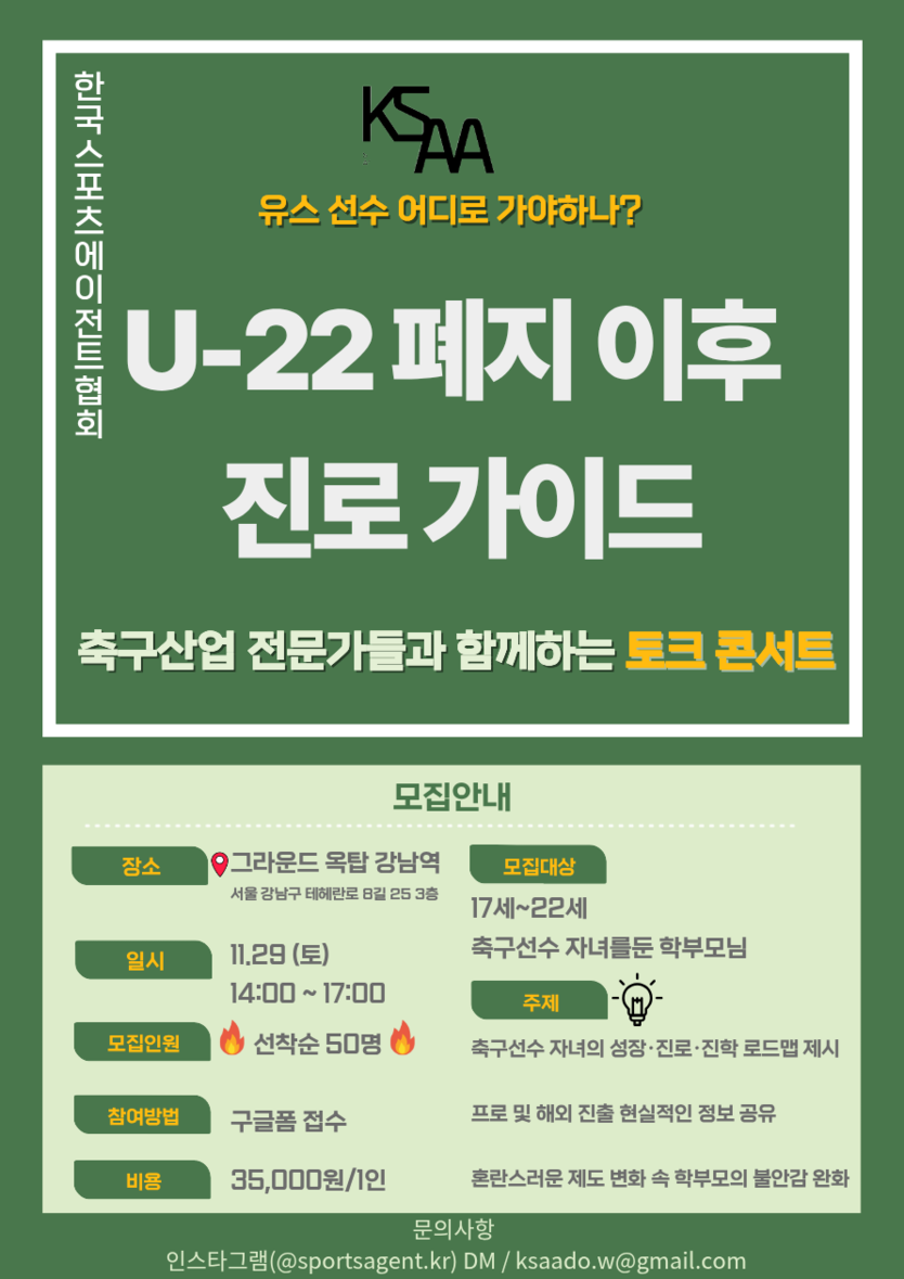 【우리일보 이기수 기자】 사단법인 한국스포츠에이전트협회(KSAA)는 오는 11월 29일, 유소년 축구 선수와 학부모를 대상으로 하는 진로 토크콘서트 ‘U-22 폐지 이후, 유스 선수의 진로 가이드’를 개최한다고 밝혔다. 최근 K리그에서 U-22 의무출전 규정이 공식적으로 폐지되면서, 유스 선수들의 프로 진출 경로와 성장 구조가 크게 변동될 것으로 예상되는 가운데 이에 대한 정확한 정보 제공이 절실하다는 현장의 요구를 반영한 행사다.