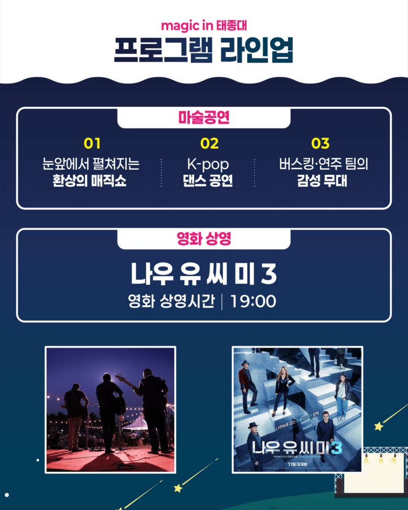 무대 프로그램 역시 다양하다. 마술 퍼포먼스, K-POP 댄스 공연, 버스킹·연주팀 무대 등 3개의 공연이 차례로 진행되며, 은은한 조명 아래에서 음악과 함께하는 감성 무대가 펼쳐진다. 이어 메인 프로그램으로 영화 ‘나우 유 씨 미 3’가 상영된다. 야외 대형 스크린과 잔디 공간을 활용해 도심 속에서 편안하게 영화를 관람할 수 있도록 준비됐다.