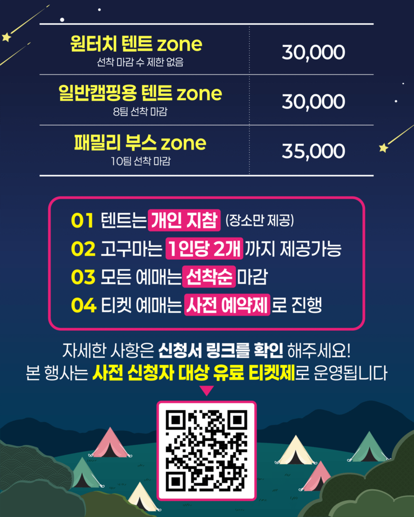 이용요금은 원터치 텐트존 3만 원, 일반 캠핑용 텐트존 3만 원(선착순 8팀), 패밀리 부스존 3만5천 원(선착순 10팀)이다. 모든 티켓은 사전 예약제로 운영되며, 고구마는 1인당 2개까지 제공된다. 신청은 안내 포스터에 포함된 QR코드를 통해 가능하며, 예매는 선착순으로 마감된다.