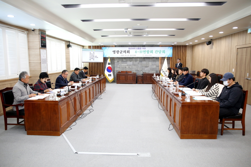 【우리일보 노연숙 기자】 영광군의회(의장 김강헌)는 21일 의원간담회실에서 영광군4-H연합회(회장 강수성)와 간담회를 갖고, 청년 농업인이 현장에서 겪는 애로사항과 지역 발전을 위한 정책 제안을 청취했다.