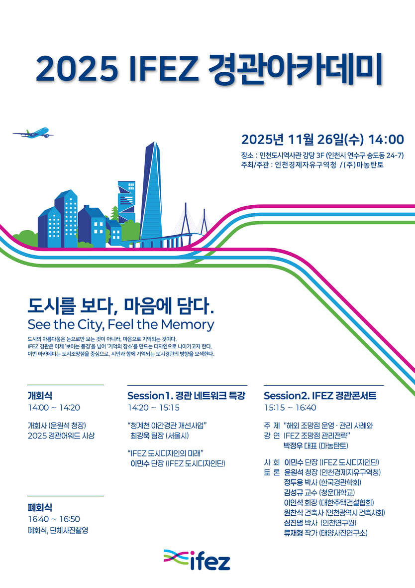 【우리일보 이진희 기자】 인천경제자유구역청은 오는 26일 인천도시역사관에서 ‘도시를 보다, 마음에 담다(See the City, Feel the Memory)’를 주제로 2025 IFEZ 경관아카데미를 개최한다고 밝혔다.