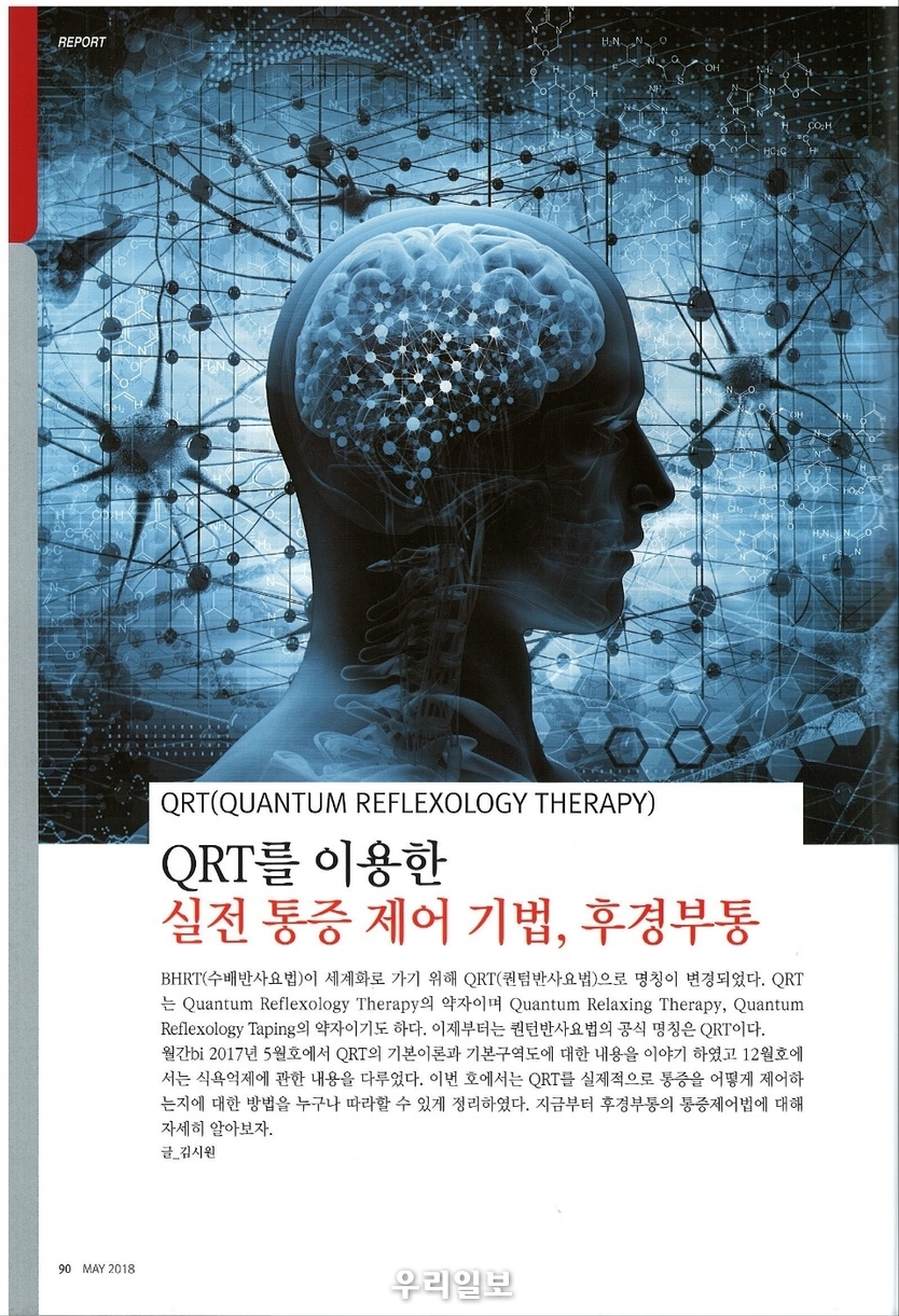 김 교수는 자신의 기법을 ‘퀀텀반사요법(Quantum Reflex Therapy·QRT)’이라고 부른다. 2017년 국내 전문 미용·테라피 잡지에 처음 소개된 ‘수배반사요법(BHRT)’을 기반으로, 이후 후경부 통증 케어와 양자 개념을 접목하며 발전시킨 방식이다.