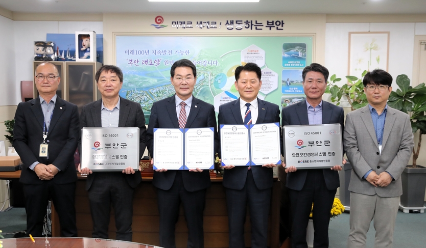 부안군은 최근 진행된 인증 심사에서 국제표준 ISO 14001(환경경영시스템)과 ISO 45001(안전보건경영시스템)을 통합으로 인증받았다.