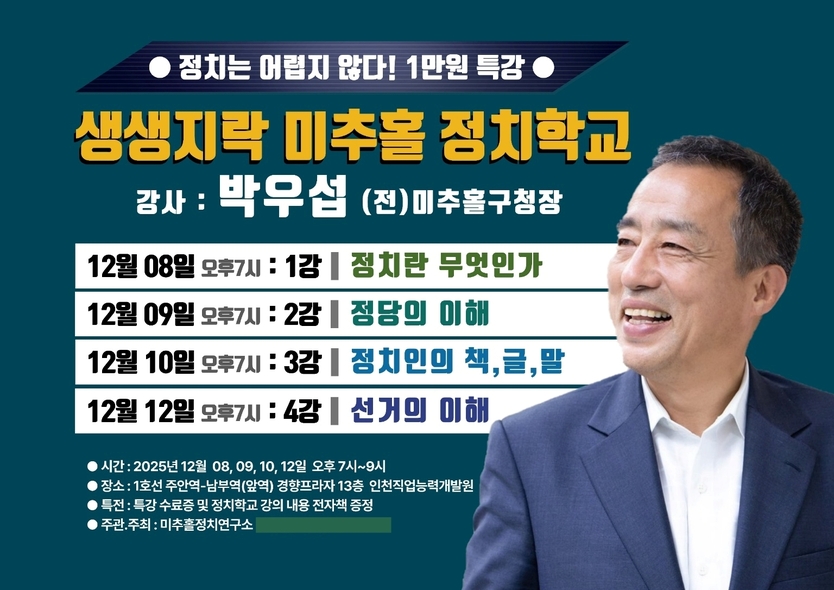 김 소장은 오는 8일부터 미추홀 정치연구소가 주관하는 ‘생생지락 미추홀 정치학교’를 4회에 걸쳐 운영한다고 밝혔다. 강사로는 박우섭 전 인천남구청장이 나서 △정치란 무엇인가 △정당의 이해 △정치인의 책·글·말 △선거의 이해 등을 주제로 강연이 진행된다.