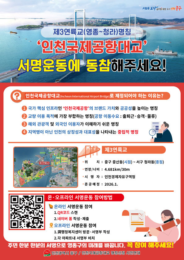 【우리일보 인천=김동하 기자】인천시 중구가 국토교통부 국가지명위원회 재심의에 앞서 제3연륙교 명칭을 ‘인천국제공항대교’로 제정하기 위한 주민 서명운동에 돌입했다고 10일 밝혔다.