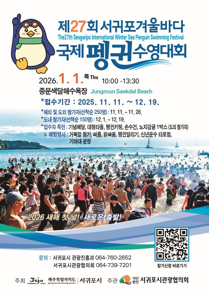 【우리일보 노연숙 기자】 서귀포시 주최, (사)서귀포시관광협의회(회장 한희섭)가 주관하는 제27회 서귀포 겨울바다 국제펭귄수영대회가 2026년 1월 1일 병오년 새해 첫날과 함께 중문색달해수욕장에서 그 막이 열린다.