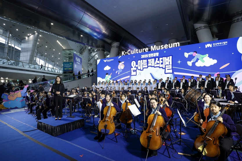 이어 13일 인천공항 제1여객터미널 교통센터에서 열린 ‘인천공항 온-아트 연주회’에서는 공사의 지원으로 운영 중인 ‘인천공항 온-아트 유스 오케스트라’와 ‘인천공항 하모니 합창단’의 합동 공연이 펼쳐져 세대를 아우르는 화합의 장이 마련됐다.