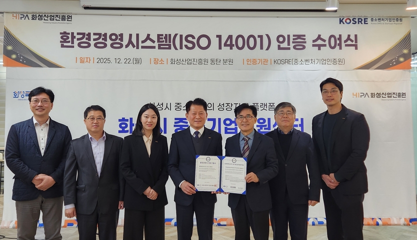 중소벤처기업인증원은 화성산업진흥원이 국제표준화기구(ISO)가 제정한 ISO 14001(환경경영시스템) 인증을 획득했다고 밝혔다.