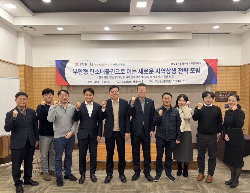 부안군 신활력플러스사업추진단(국장 정우중)은 지난 18일 부안형 탄소배출권으로 여는 새로운 지역상생 전략 포럼을 개최하고, 지역 특성을 반영한 탄소감축 사업과 자발적 탄소시장 활용 방안에 대해 심도 있는 논의를 진행했다고 밝혔다.