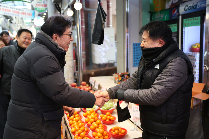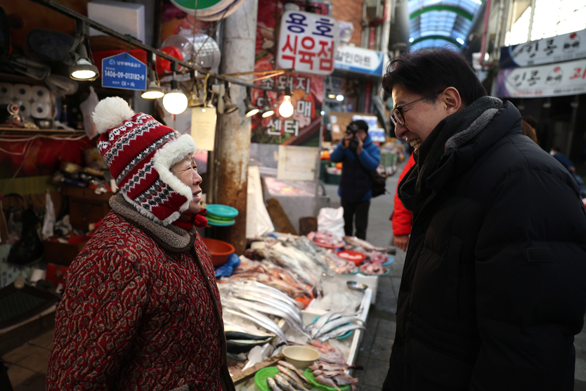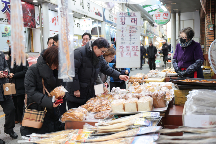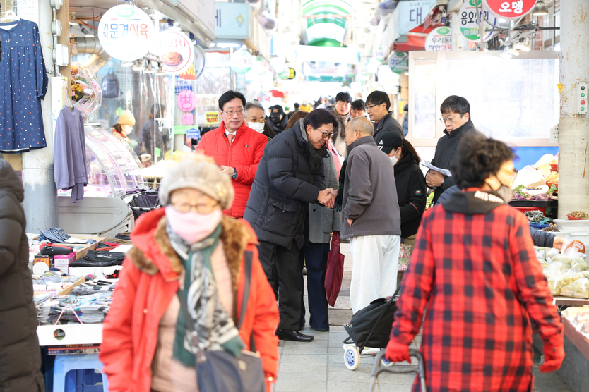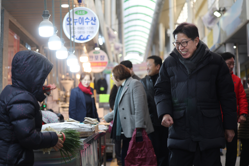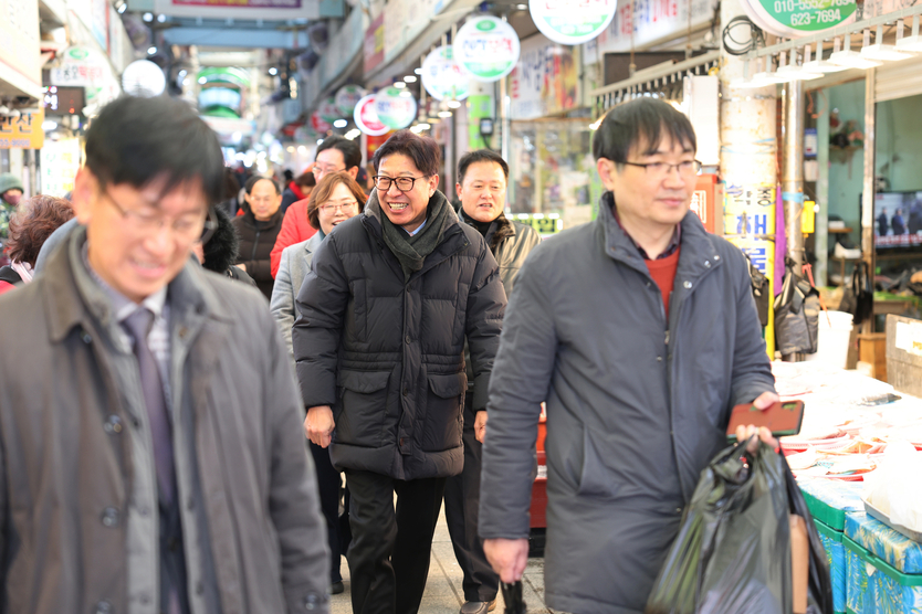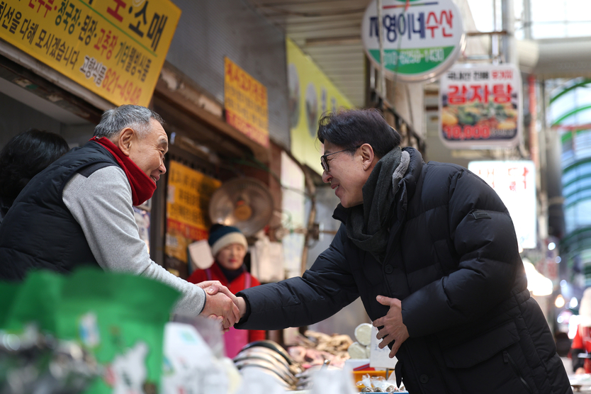 【우리일보 김지윤 기자】 박형준 부산시장이 26일 오후 남구 용호골목시장과 용호시장을 연이어 방문하며 세밑 민생 현장을 살폈다. 이날 박 시장은 상인들의 애로사항을 청취하고, 2026년 진행될 시설현대화 사업 예정지를 직접 점검하며 "전통시장에 활력을 불어넣겠다"고 약속했다.