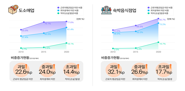 도소매업 역시 사정은 크게 다르지 않았다. 평균 영업이익은 2,520만 원이었으나, 근로자 평균임금 미만 사업체가 77.6%, 최저생계비 미만 사업체는 '61.4%'였다. 10곳 중 6곳 이상이 사실상 빈곤층 수준의 소득에 머물고 있는 셈이다.