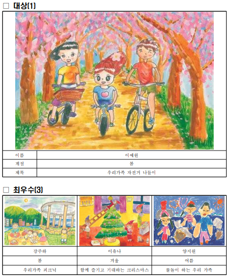 부산시는 31일부터 내년 1월 3일까지 도시철도 1호선 시청역 연결 통로에서 '행복한 우리 가족, 부산 사계(四季) 이야기 달력 그림 공모전' 수상작 전시회를 개최한다.