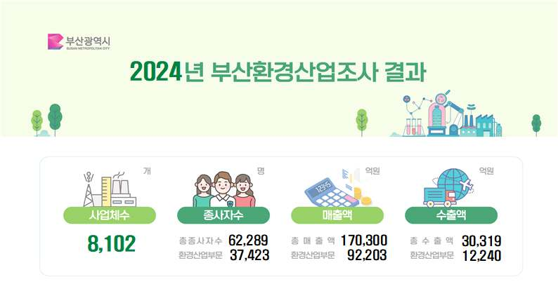 부산시는 31일, 부산 소재 종사자 1인 이상 모든 환경사업체 약 9천여 개를 대상으로 실시한 '2024년 기준 부산환경산업조사' 결과를 발표했다. 조사 결과에 따르면, 부산의 환경산업 사업체 수는 8,102개로 전년 대비 3.8% 증가했으며, 종사자 수는 3만 7,423명으로 5.7% 늘어났다.