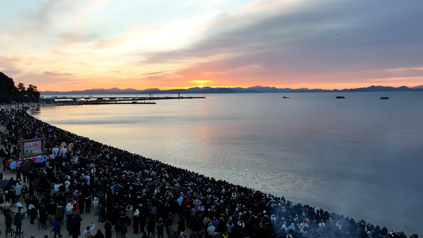 어둠을 뚫고 수평선 위로 힘차게 솟아오르는 붉은 태양을 바라보며 저마다의 소원을 비는 수만의 인파가 어우러져 장관을 연출했다.