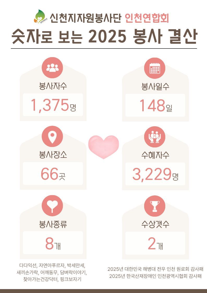 인천지역연합회는 7개 지역 지부가 하나의 운영 체계 아래 참여해 봉사를 진행했으며 연간 누적 1375명의 봉사자가 참여해 148일 동안 66개 현장에서 활동했다.