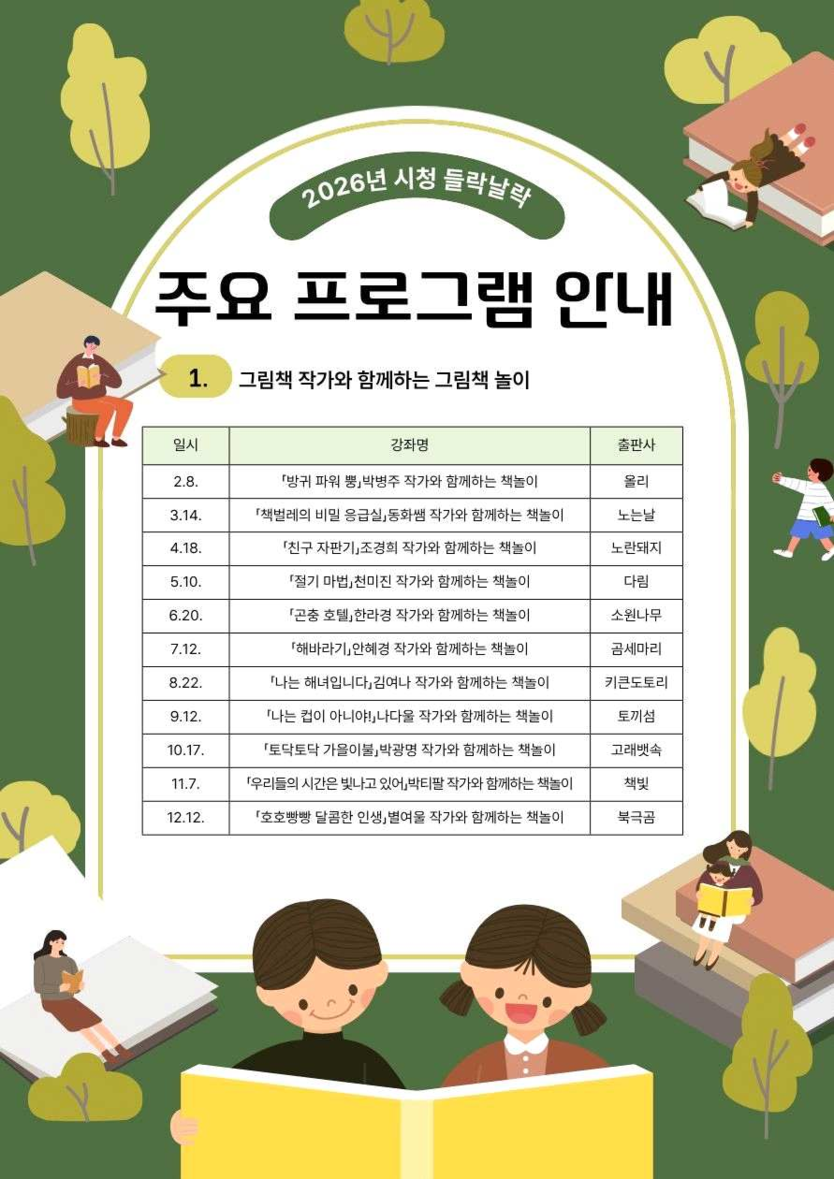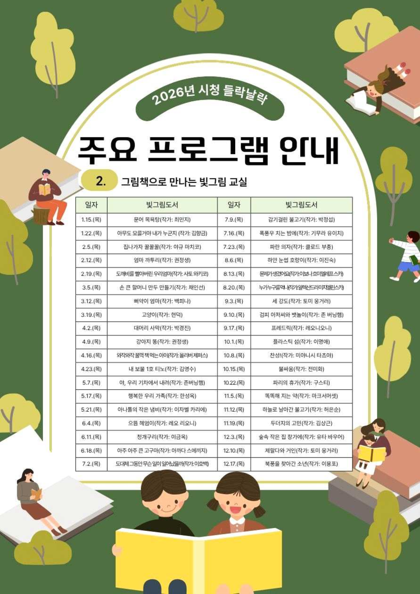 올해 프로그램은 총 30여 종으로 그림책 작가와 함께하는 책놀이 교실과 빛과 그림자를 활용한 동화 구연 등이 대표적입니다. 특히 매주 목요일 운영되는 빛그림 교실은 소규모 대면 방식으로 진행되어 가족 단위 방문객들의 큰 호응을 얻을 것으로 기대됩니다.
