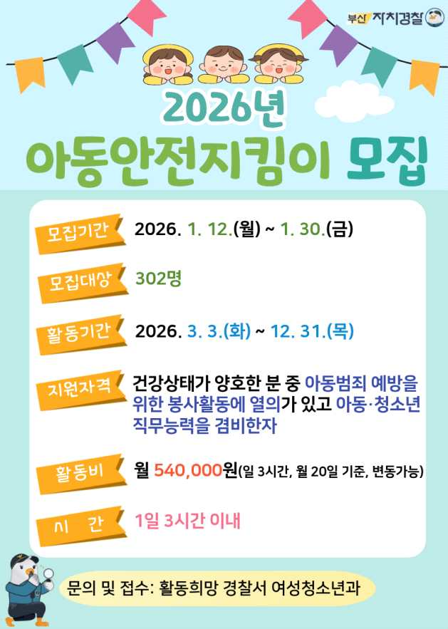 【우리일보 김지윤 기자】 부산광역시 자치경찰위원회와 부산경찰청이 초등학교 통학로 안전을 책임질 2026년 아동안전지킴이 302명을 모집한다. 아동안전지킴이는 등하굣길 도보 순찰을 통해 아동 범죄를 예방하고 위험 요소를 점검하는 시민 참여형 치안 사업이다.