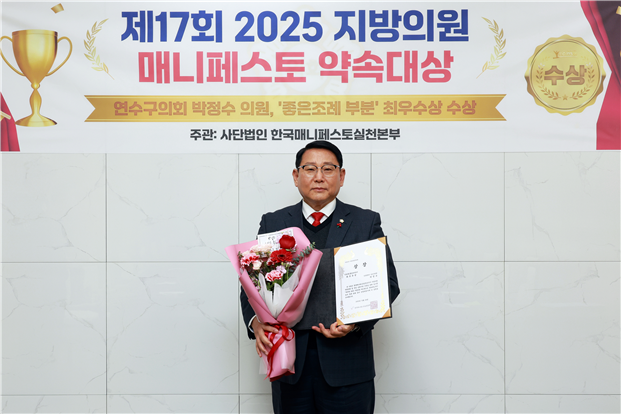 【우리일보 인천=구광회 기자】인천시 연수구의회 박정수 의원이 지난달 26일, 한국매니페스토실천본부가 주관하는 ‘제17회 2025 지방의원 매니페스토 약속대상’에서 좋은 조례 분야 최우수상을 받는 영예를 안았다.
