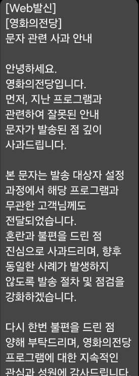 이에 대해 영화의전당 측은 13일 오후 1시 2분경 공식 사과 문자를 발송하고 진화에 나섰다. 전당 측은 사과문을 통해 “발송 대상자 설정 과정에서 해당 프로그램과 무관한 고객님께도 문자가 전달되었다”며 오류를 시인했다.