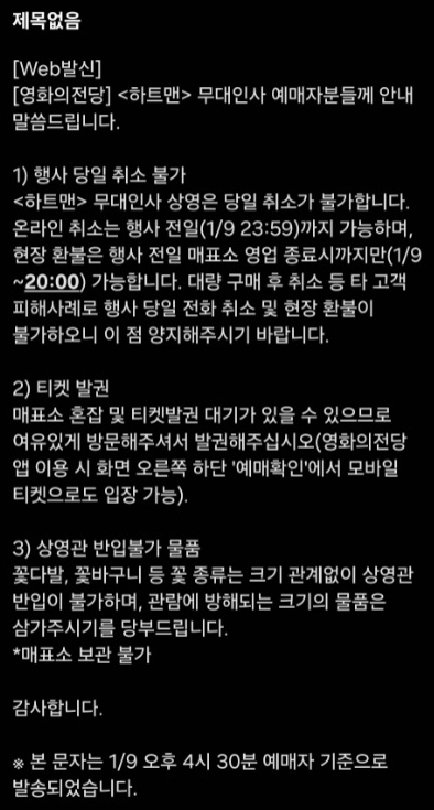 13일 영화의전당과 시민들에 따르면, 전날 오후 5시 12분경 영화의전당 측은 영화 <하트맨> 무대인사 예매자들을 대상으로 ‘행사 당일 취소 불가’ 및 ‘반입 불가 물품’ 등을 안내하는 문자를 발송했다. 하지만 이 과정에서 해당 프로그램을 예매하지 않은 다수의 일반 시민에게까지 해당 문자가 전달되면서 혼란을 야기했다.