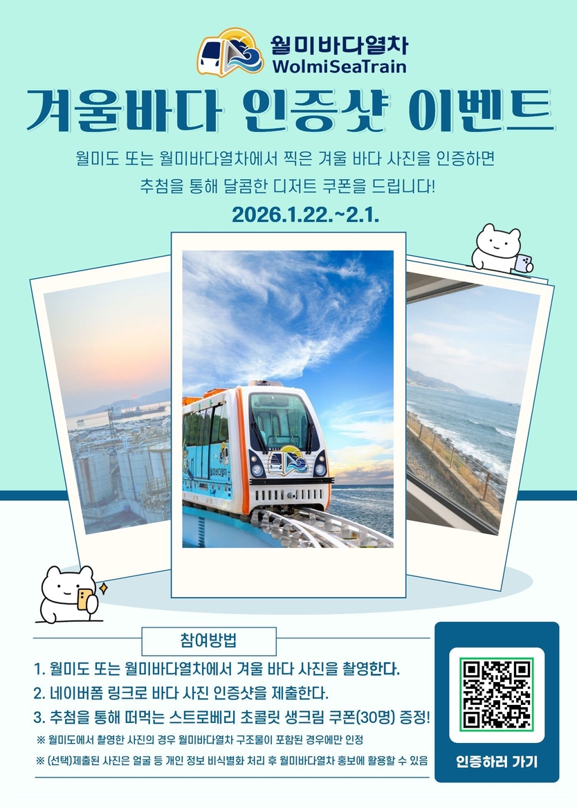 【우리일보 인천=장명진 기자】인천교통공사가 겨울철 월미도 바다의 정취를 시민들과 공유하기 위해 ‘월미바다열차 겨울 사진 인증 이벤트’를 진행한다고 밝혔다.