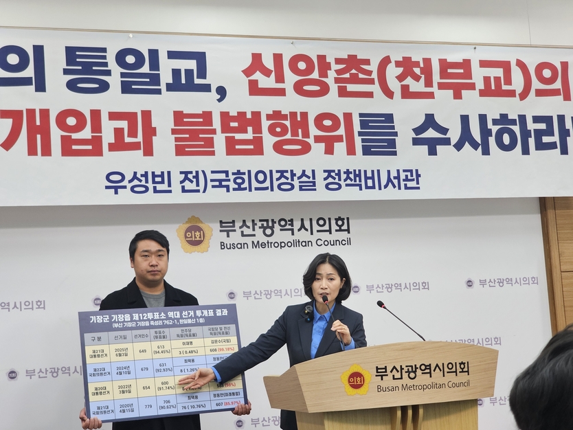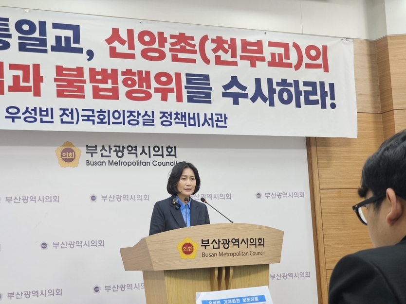 【우리일보 김지윤 기자】우성빈 전 국회의장실 정책비서관이 21일 오전 부산시의회 브리핑룸에서 기자회견을 열고 부산 기장군 신앙촌(천부교)과 특정 정당 사이의 '표-특혜 맞교환' 의혹에 대한 수사 당국의 즉각적인 수사를 촉구했다.