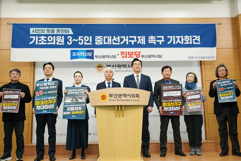 【우리일보 김지윤 기자】 조국혁신당 부산시당과 진보당 부산시당이 거대 양당의 기득권 독점 구조를 타파하기 위해 기초의원 3~5인 중대선거구제 도입을 촉구하는 공동 기자회견을 가졌다.