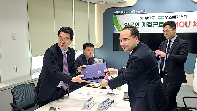 【우리일보 노연숙 기자】 부안군은 지난 23일 농업 분야 외국인 계절근로자 도입 확대를 위해 우즈베키스탄 안디잔주와 업무협약(MOU)을 체결했다고 밝혔다.
