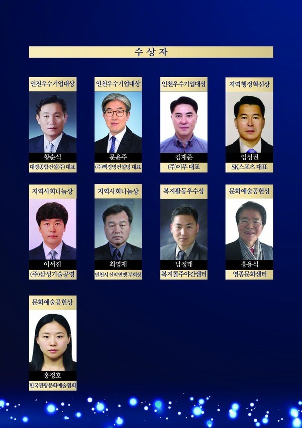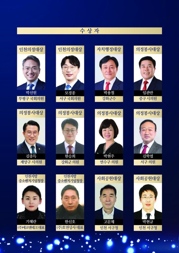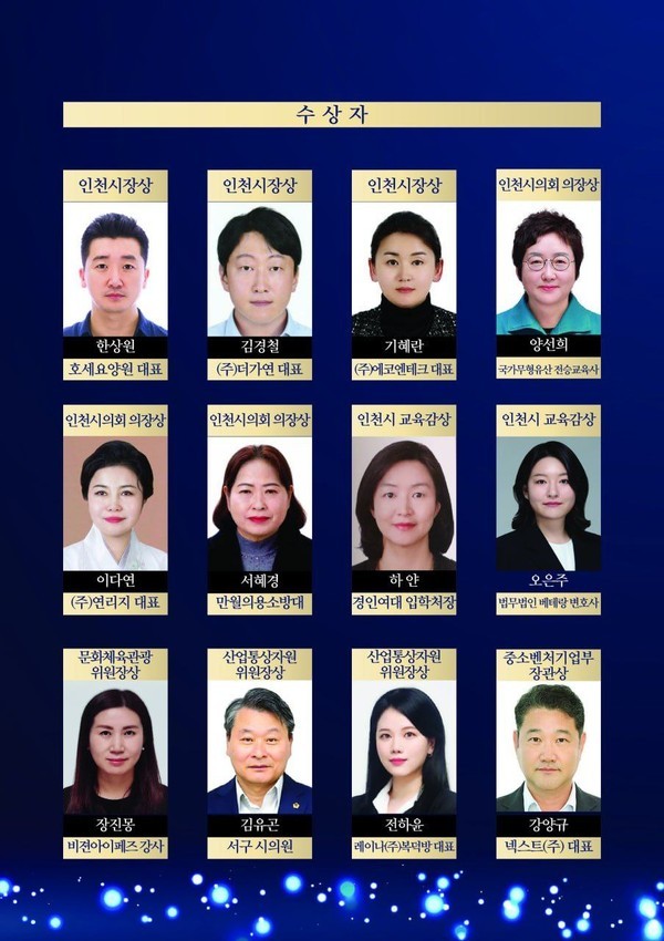 ▲인천시장상: (3명),▲인천시의회의장상: (3명),▲인천교육감상: (2명),▲중소벤처기업부 장관상: (1명),▲국회 문화체육관광위원장상: (1명),▲국회 산업통상자원중소벤처기업위원장상: (2명),▲인천의정대상/자치행정대상/의정봉사대상/사회공헌대상/우수기업대상 등
