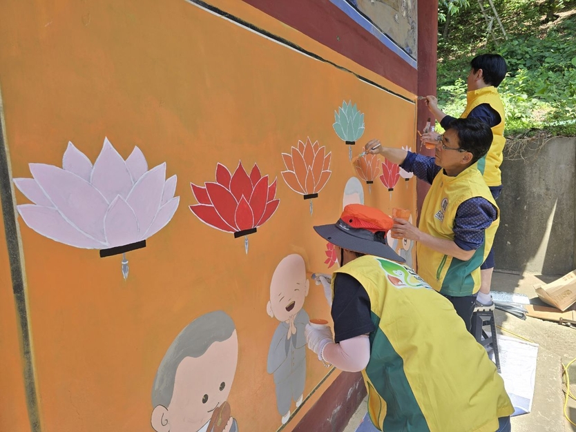 서인천지부는 ‘사랑은 인연이 되어’를 주제로 사원 담장과 대웅전 외벽에 연꽃과 동자승을 그려 넣는 벽화 봉사를 진행했다. 이번 활동은 사원 측의 요청과 지역 사회와의 상생을 바라는 봉사단의 뜻이 맞물리며 성사됐으며, 연인원 40여 명의 봉사자가 참여해 정성을 다했다.